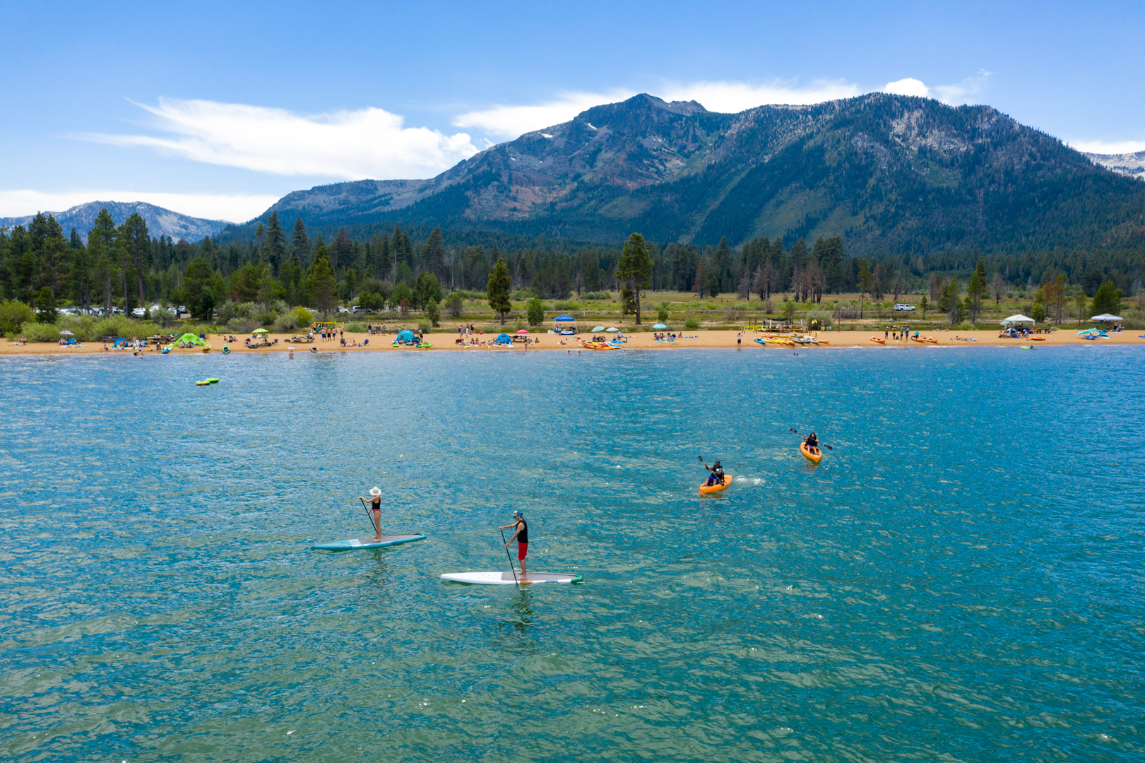 Pope Beach is a long sandy shoreline with shallow, swimmable water and beautiful mountain views. It’s perfect for families, paddleboarding, beach days, and sunset walks. The beach offers picnic areas and easy access, making it one of the most popular and relaxing beaches in South Lake Tahoe.